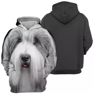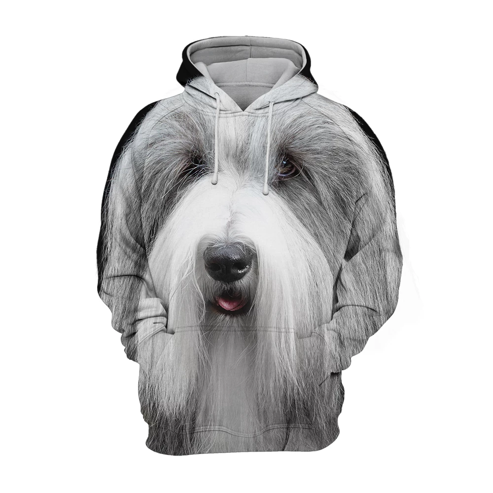 Features a captivating, **high-definition Bearded Collie** across the entire hoodie.