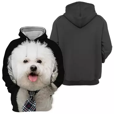 Features a captivating, **high-definition Bichon Frise** across the entire hoodie.
