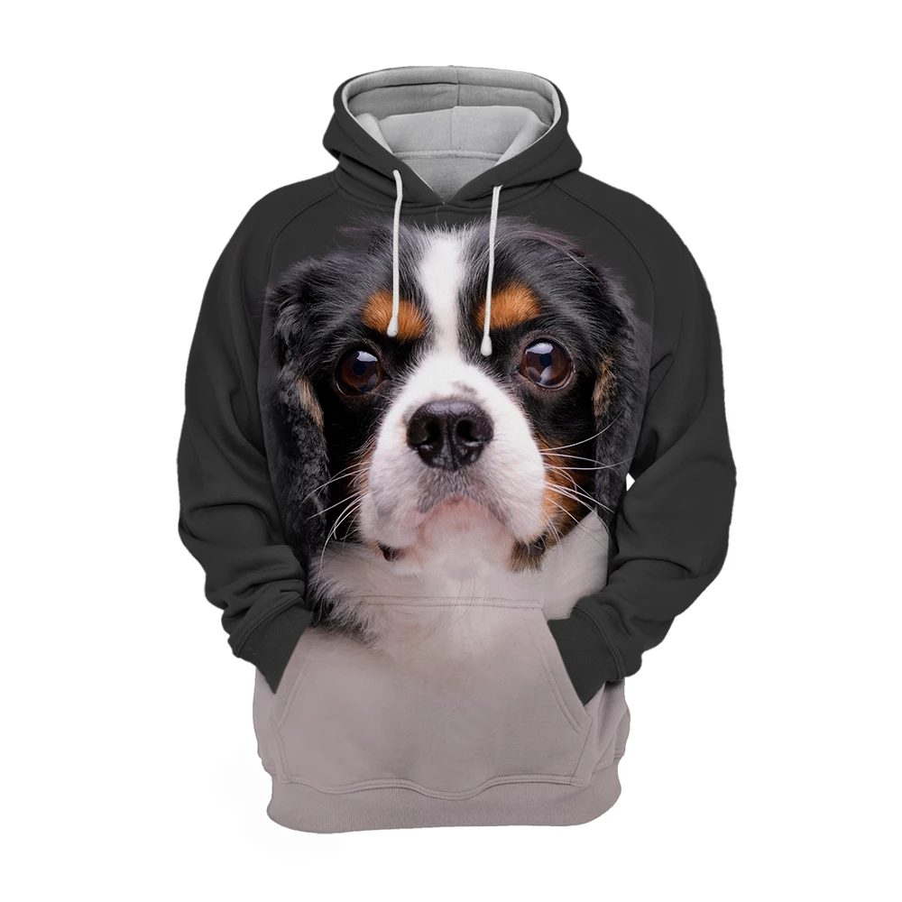Features a captivating, **high-definition Cavalier King Charles Spaniel** across the entire hoodie.
