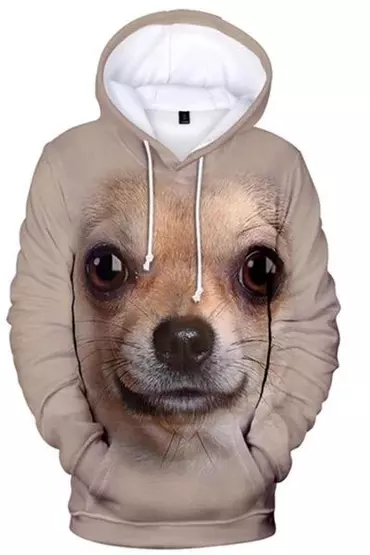Features a captivating, **high-definition Chihuahua** across the entire hoodie.