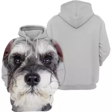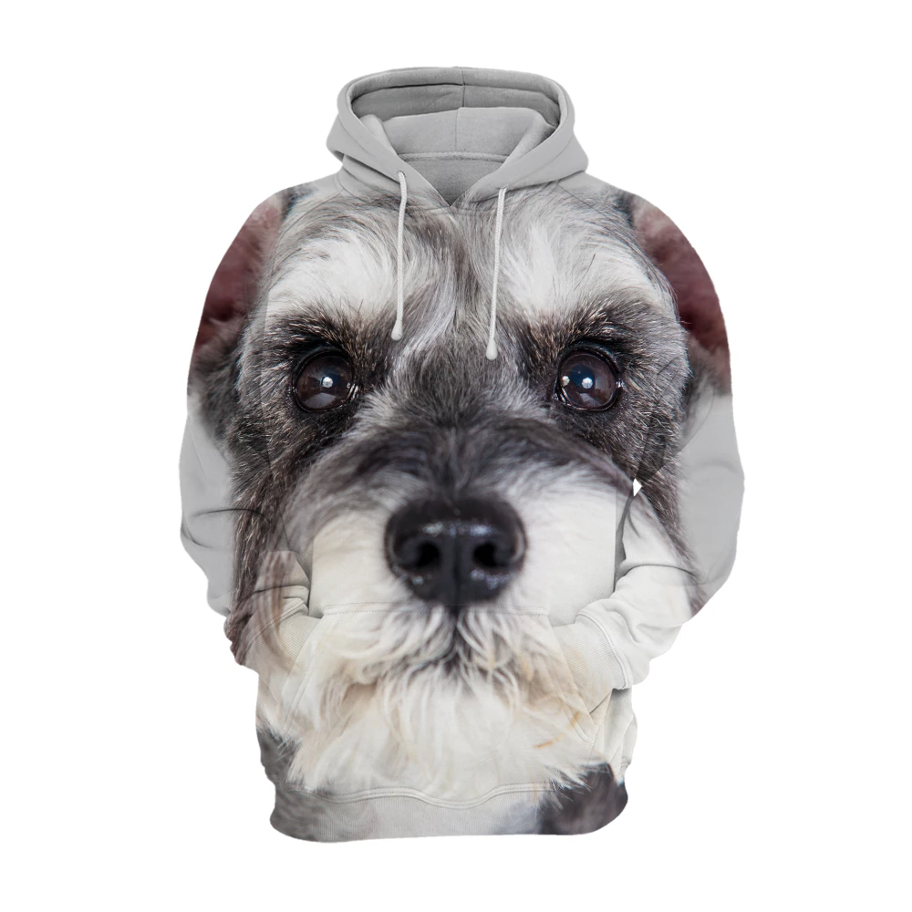 Features a captivating, **high-definition Miniature Schnauzer** across the entire hoodie.