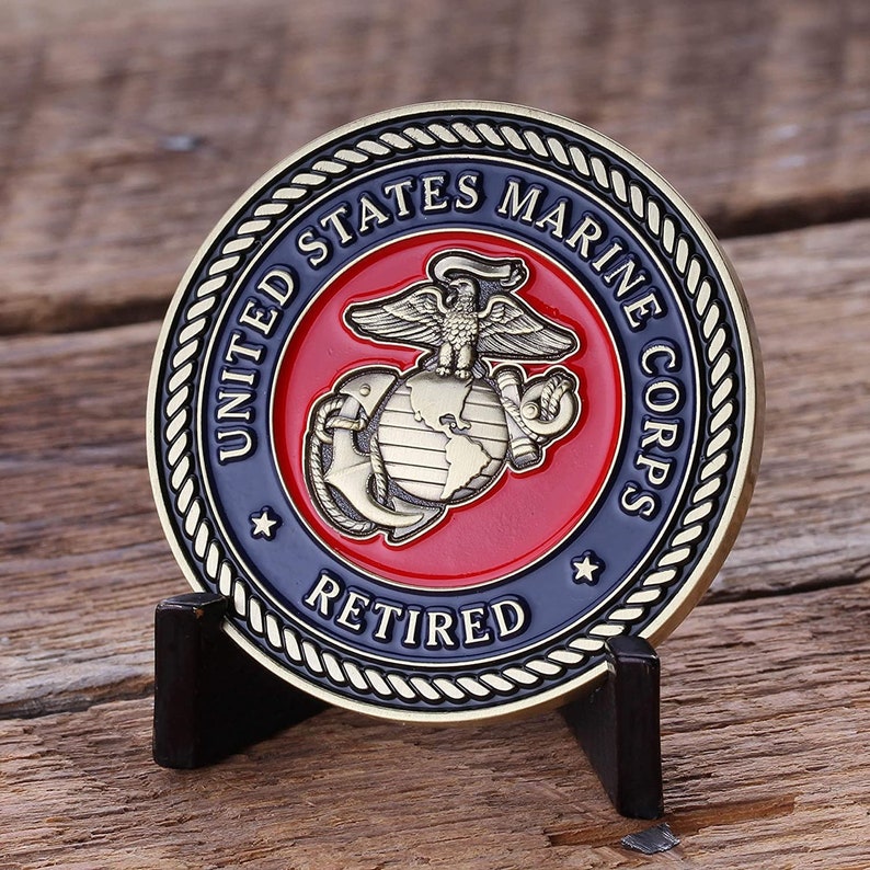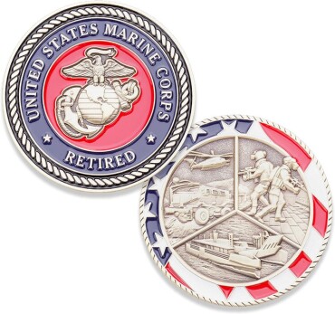 Marine Corps: features a 3D Eagle, Globe, and Anchor in the center, surrounded by rich scarlet and bordered with "United States Marine Corps Retired" and stars on a Navy blue background. The reverse side of the coin features an MRAP, a CH-53 Super Stallion, Marines in combat, and an amphibious landing craft in raised brass, surrounded by a patriotic flag border.