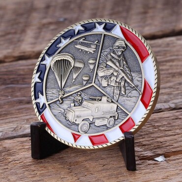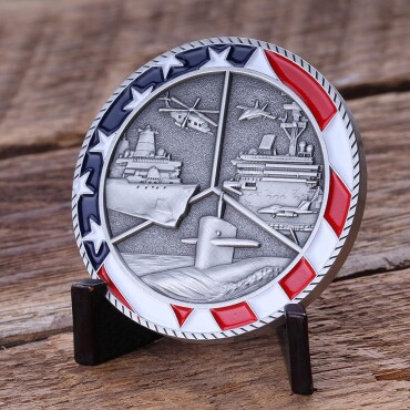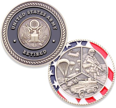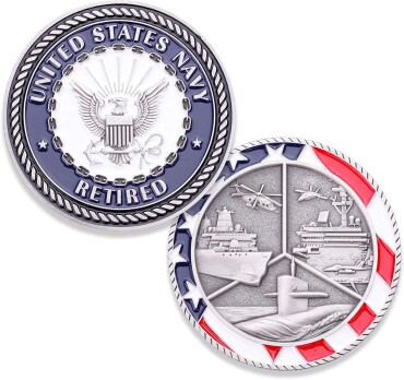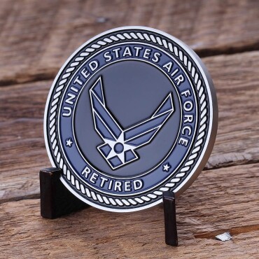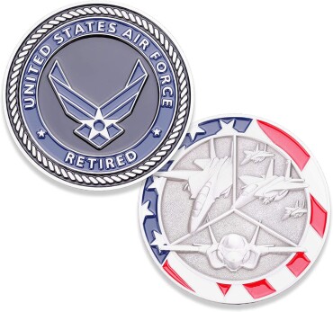 Air Force:Features the Air Force logo on a black background below the words, "United States Air Force" on a rich blue background, with surrounding stars, and text at the bottom that says, "Retired". The reverse side of the coin features 3-d images of an F-14 Tomcat, an F-22 Raptor, and three F-15 Eagles in formation. This side has a textured background and is surrounded by an American flag border.