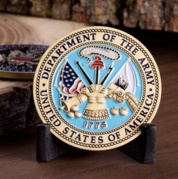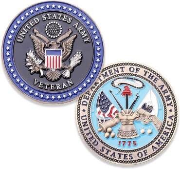 Veteran:Features The Great Seal of the United States in color, on a black background, surrounded by stars and the words "United States Army Veteran" in raised brass. The reverse side features the Department of the Army Emblem in bright full color.